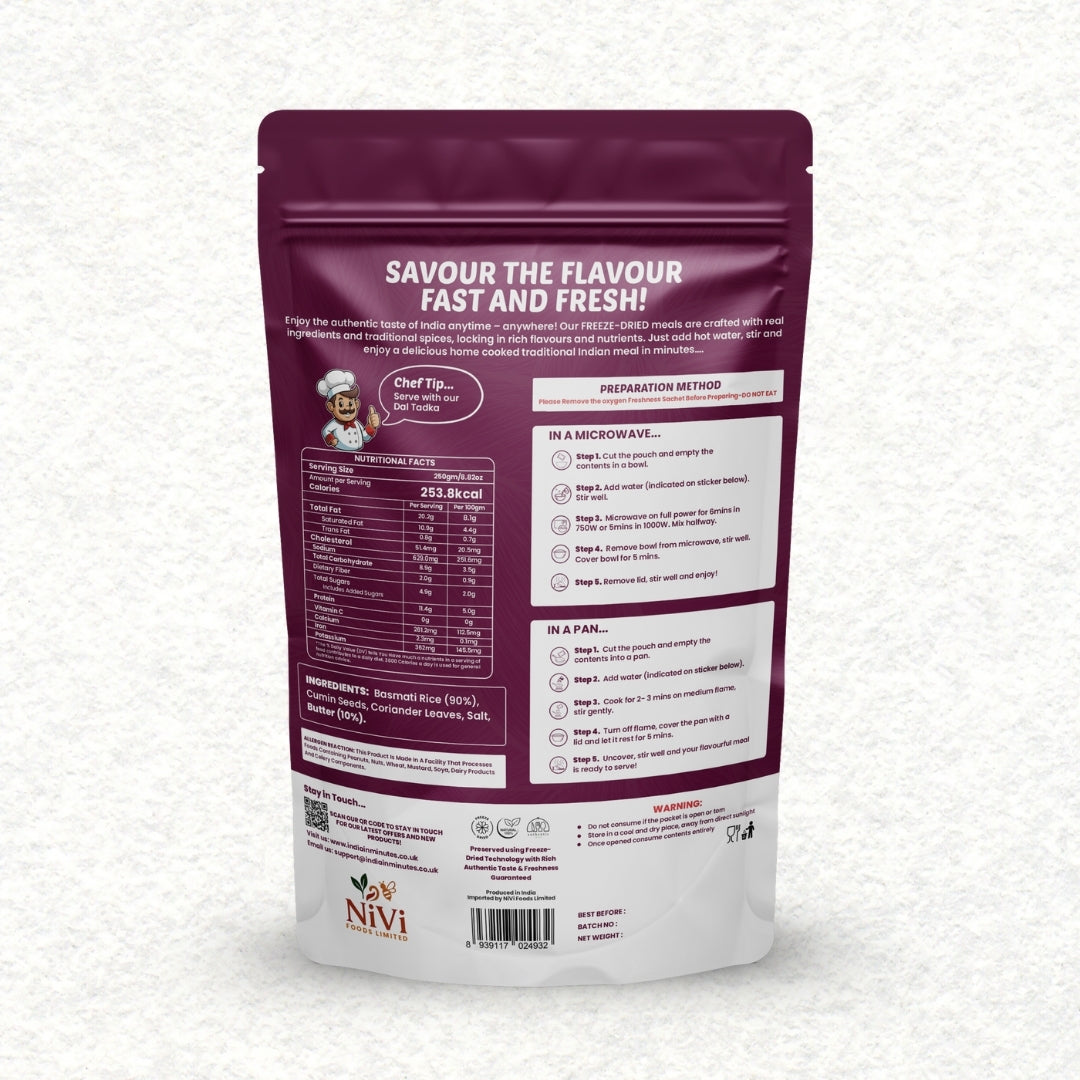 At India in Minutes, we believe even the simplest dishes should taste amazing. Our Jeera Rice is made from premium basmati rice and real Indian spices, freeze-dried for freshness and convenience. Whether you're rushing through lunch or preparing a quick dinner, this is your go-to rice companion.